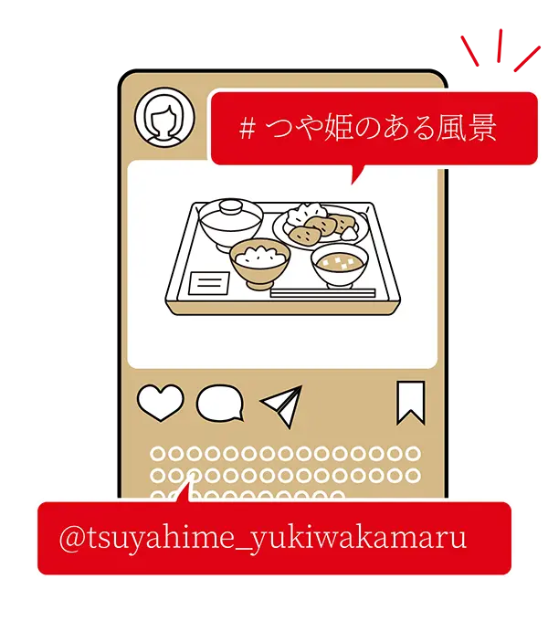 - 作成した動画に指定ハッシュタグ『#つや姫のある風景』をつけ、公式アカウント(@tsuyahime_yukiwakamaru)をメンションしてInstagramに投稿する。